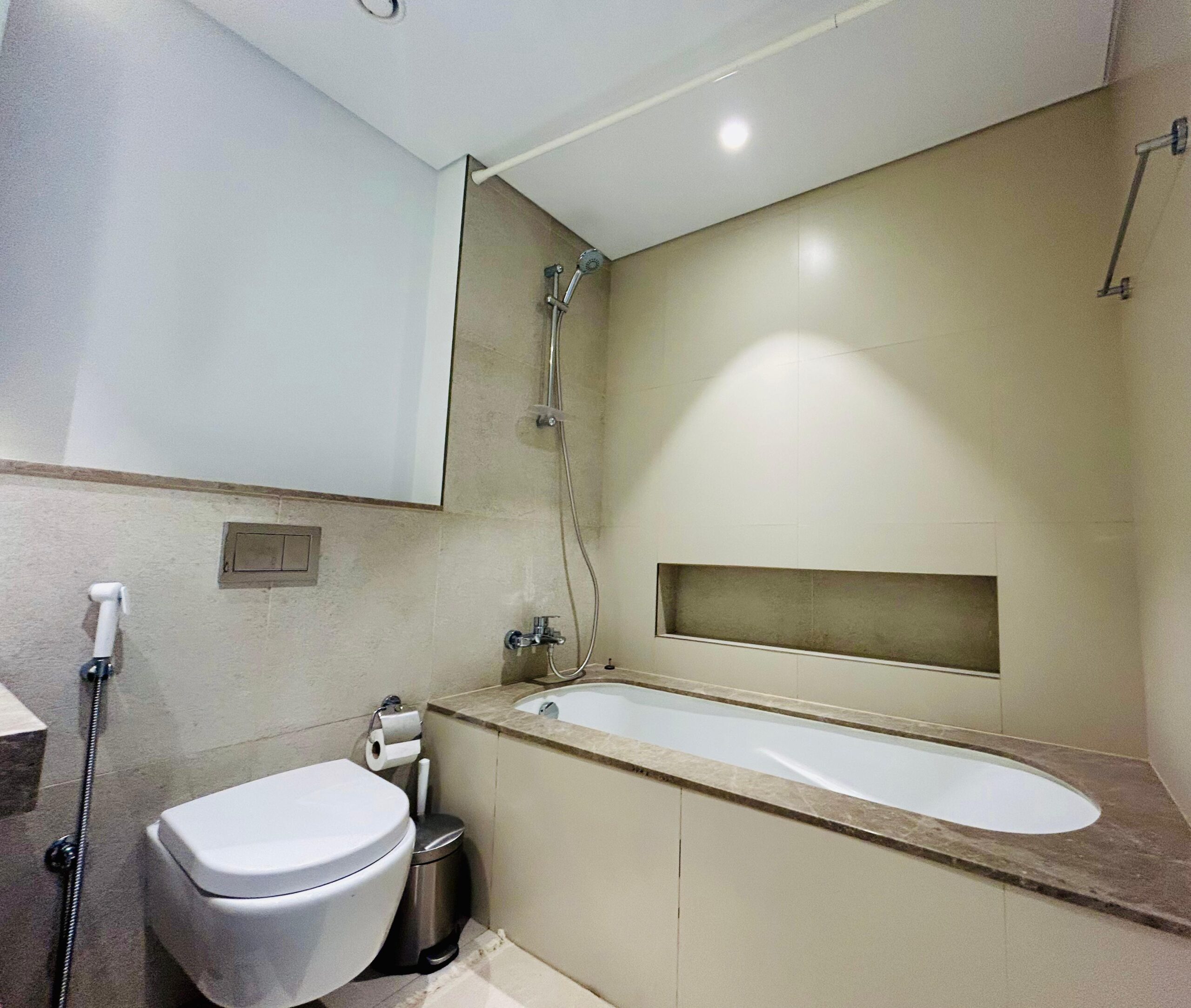 Spacious and stylish with a bathtub, rainfall shower, fresh towels, hairdryer, and essential toiletries.